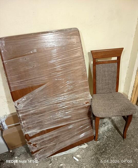 Stół drewniany rozkładany+ 6 krzeseł wymiary 160-90 po rozłożeniu 240-90 2 części po 40 cm/ obicia krzeseł w ...